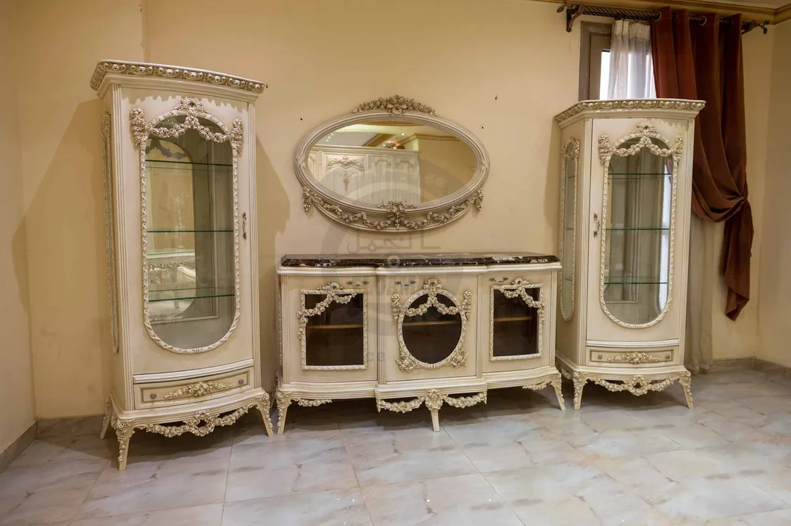 تتكون الغرفة من ترابيزة طعام أنيقة مع 6 كراسي منجدة توفر راحة مثالية أثناء الاستخدام، إلى جانب بوفيه كلاسيك عملي للتخزين، وبرواز مرايا كلاسيك يضفي إحساسًا بالاتساع والفخامة، بالإضافة إلى عدد 2 نيش كلاسيك لعرض القطع المميزة بأسلوب أنيق.