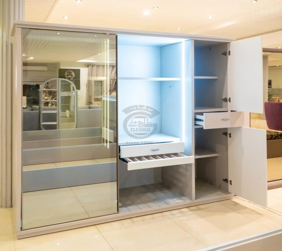 غرفة تحتوى على : 2 سرير . دولاب تقسيم دريسينج . تسريحه مع وحدات أدراج . بف تسريحه . 2 كومود الغرفة مصنعه من الاخشاب الطبيعيه بطابع عصرى مميز يليق بمنزلك